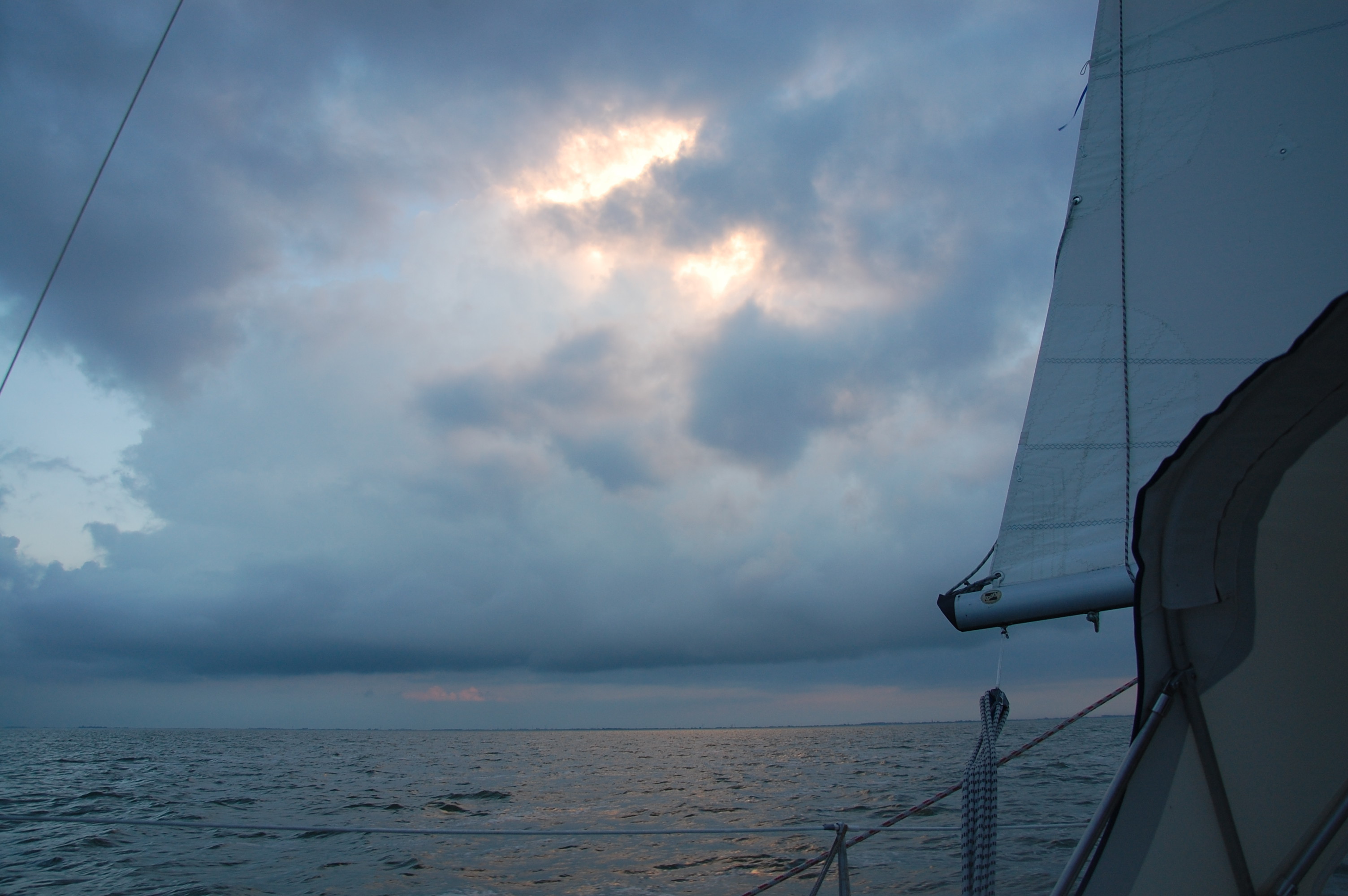 De EZ3 wordt gerond, in de onweer en regen…niet veel later begint de wind wat af te nemen, snel weer lichtweerzeil.. wind begint te draaien en nog verder af te nemen… 10 minuten later.. geen wind!!! Wat is dit nu? Hier had ik geen rekening mee gehouden! Windstil, met golven.. alles slaat heen en weer, haal alle zeilen weg en ga liggen wachten… Ik ben niet de enige die ligt te drijven, sommige besluiten om uit het rak te ‘stappen’ en gaan richting Urk te varen… Na ruim een uur en heel veel regen, neemt de wind weer toe, langzaam weer onderweg naar EL-A…