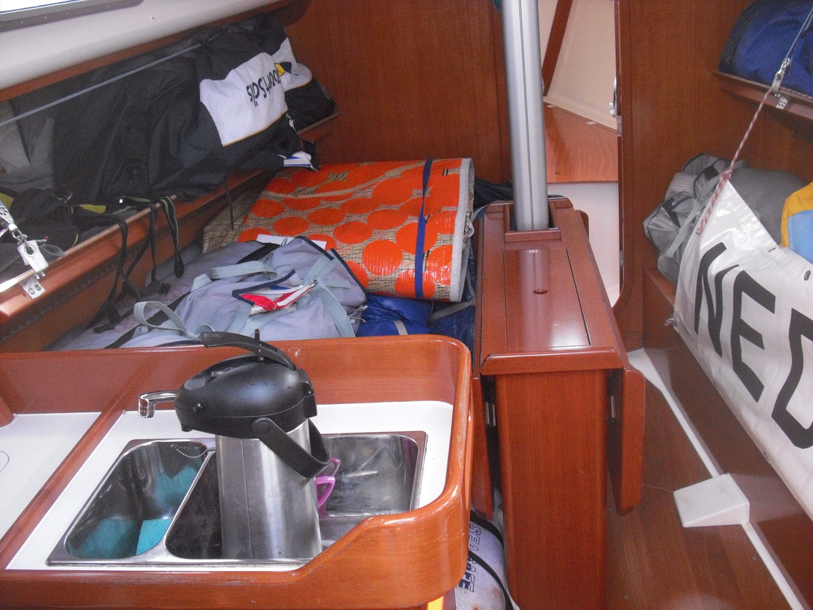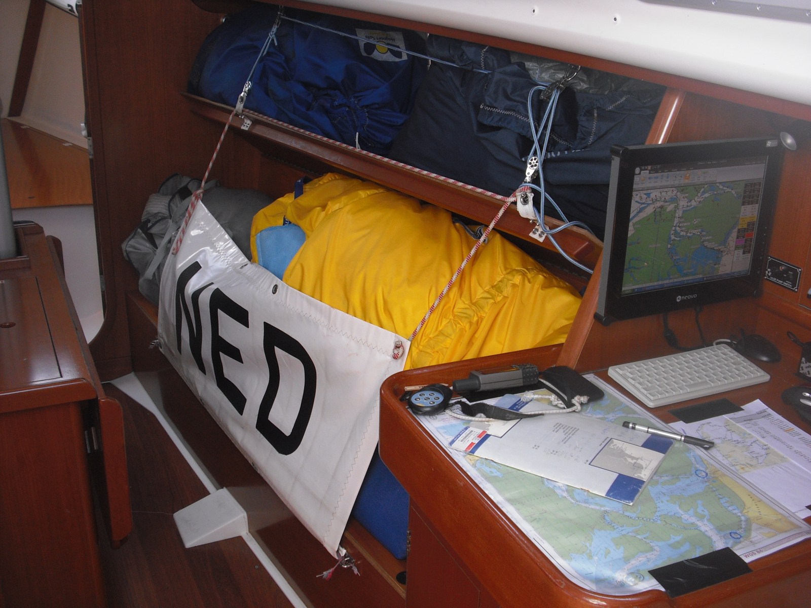 Als hoogste op de lijst, heb ik deze 200myls boot management gezet. Normaal begin ik te varen en zie wel wat er naar beneden komt vallen bij de eerste keer wat helling.. Nu is mijn aanpak anders, alles vast, wat niet nodig wordt diep weggestopt en alles verder een vaste plaats… Mijn voornemen is ook tijdens het varen alles zo goed mogelijk te organiseren. De kussens worden verpakt in grote plasic zakken, zodat het droog blijft, want is ook mijn kooi… Voor in de punt liggen geen kussens, maar is zeil storage, waar 7 voorzeilen liggen te wachten op deployment…